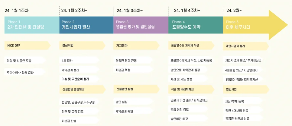 ⑤ 사후 세무관리 | 4대보험 재설정, 퇴직금 처리, 법인세/소득세 구조 점검 |